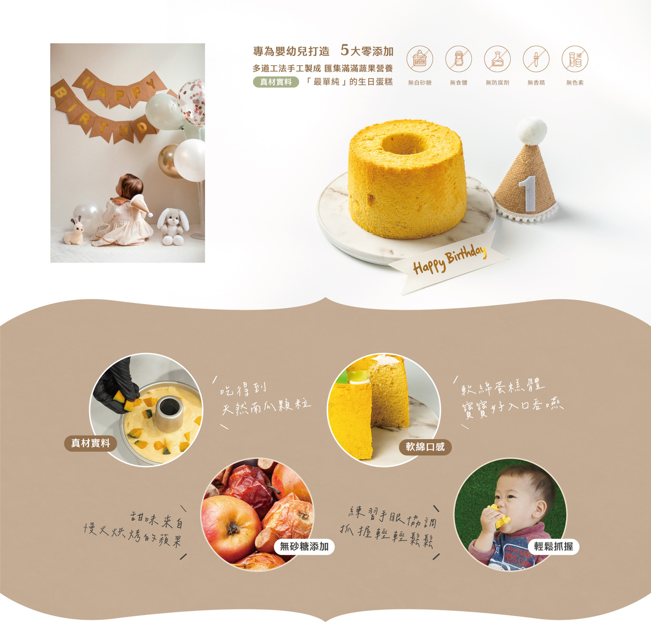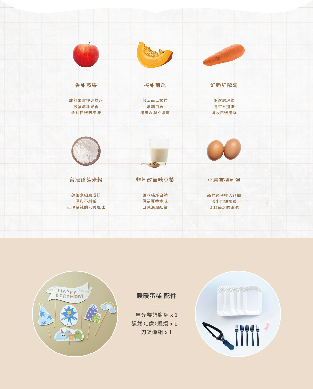 成分|小農有機雞蛋、有機米穀粉、蘋果、紅蘿蔔、南瓜、非基改無糖豆漿、玄米油、非基改玉米粉