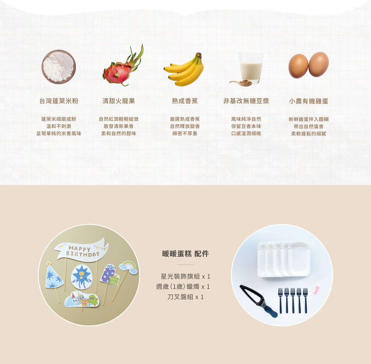 成分|小農有機雞蛋、有機米榖粉、香蕉、火龍果、非基改無糖豆漿、玄米油、非基改玉米粉
