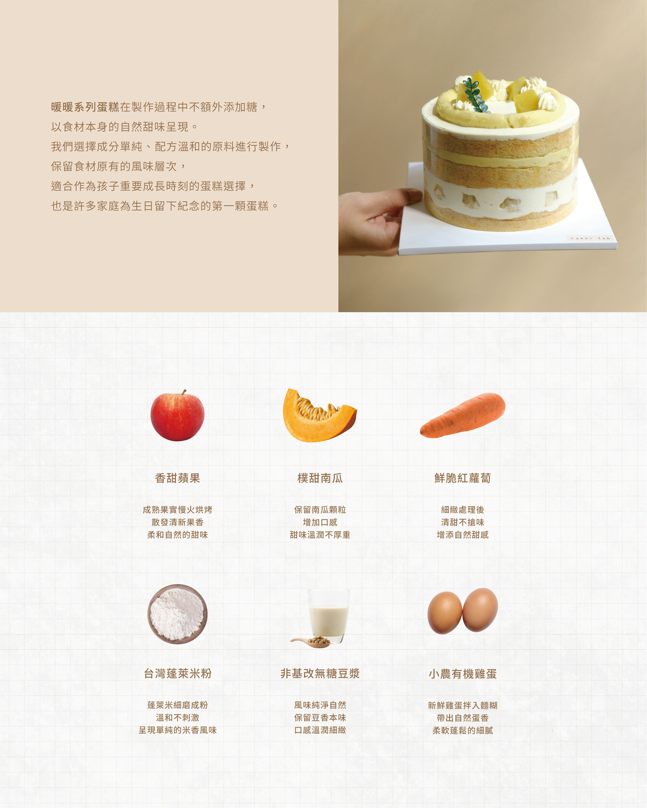 成分|動物性鮮奶油、地瓜、小農有機雞蛋、香蕉、有機米穀粉、蘋果、紅蘿蔔、非基改無糖豆漿、玄米油、非基改玉米粉